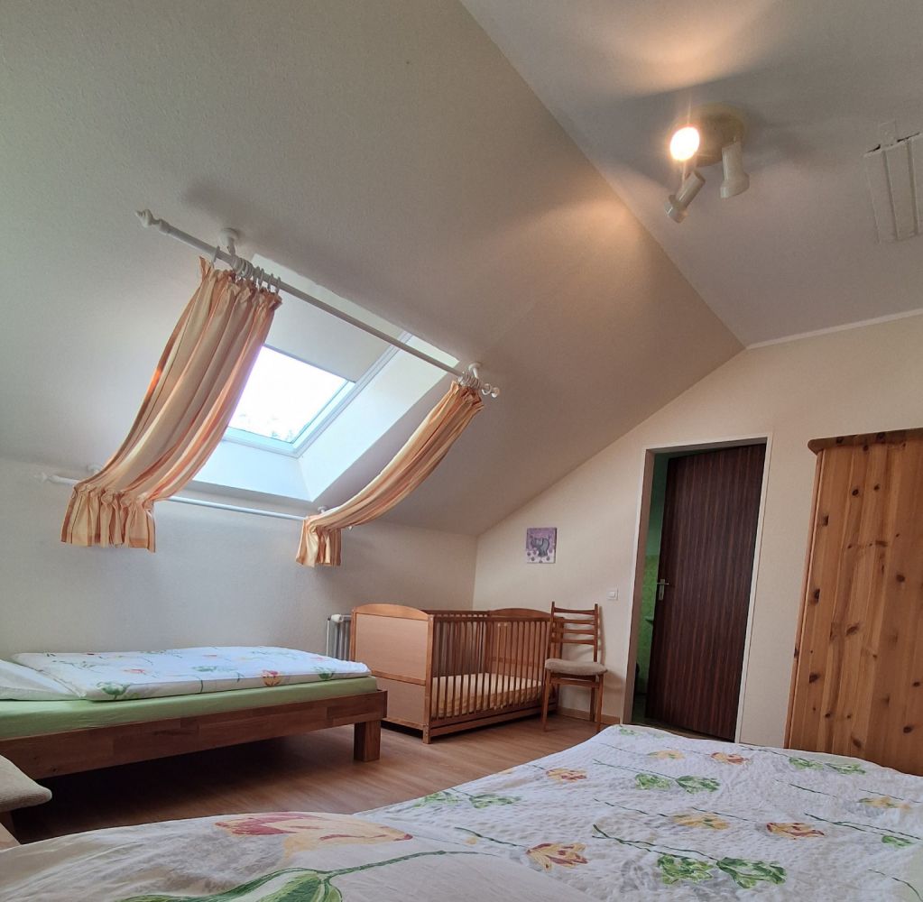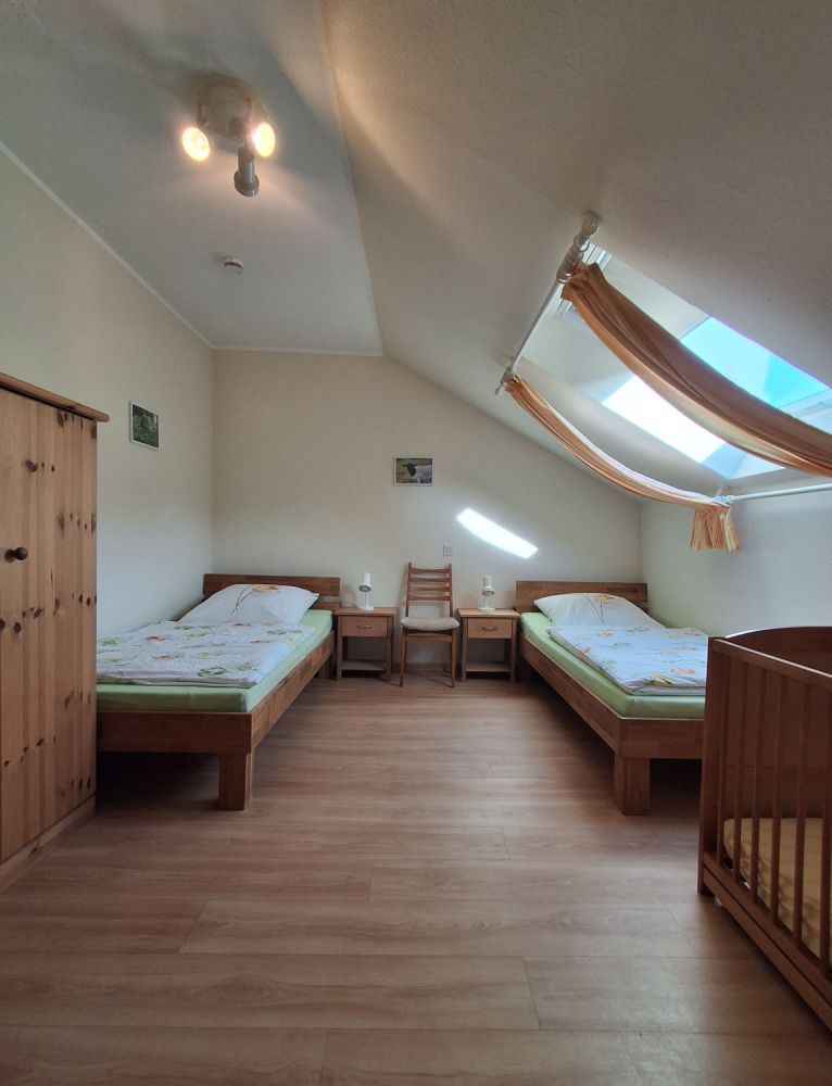 Ein Schafzimmer mit Doppelbett und ein kleines Schlafzimmer mit zwei Einzelbetten und Kinderbett.